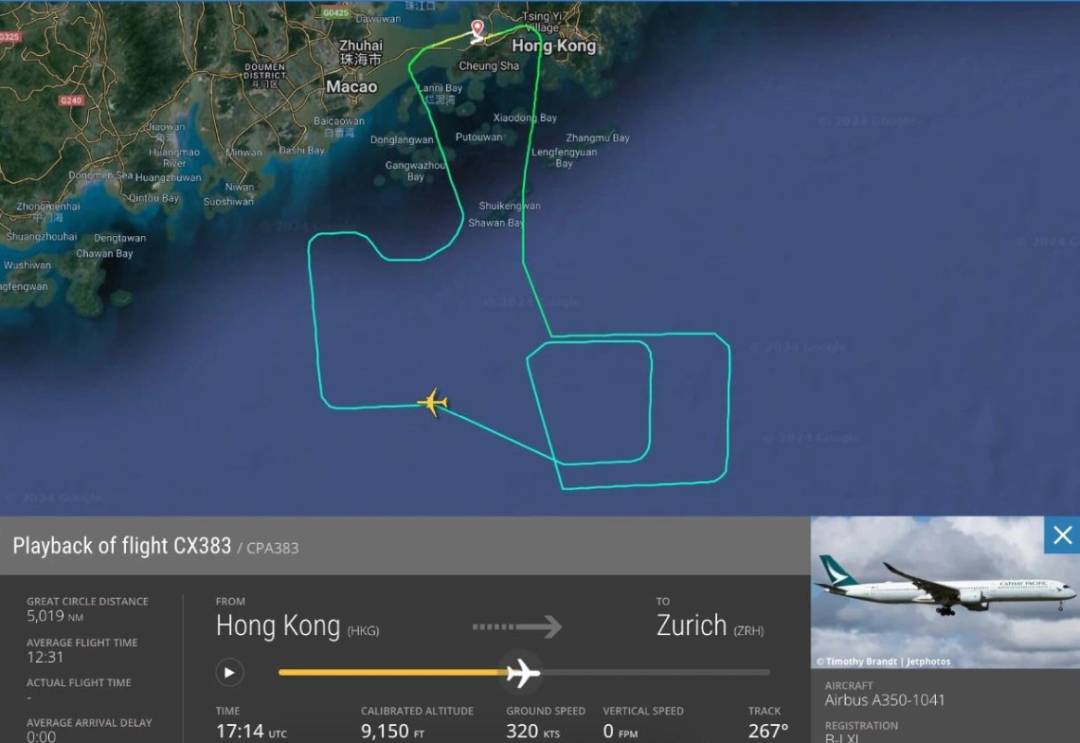 Cathay Pacific flight CX383 departed Hong Kong International Airport for Zurich Airport in Switzerland at 00:07am on September 2, 2009, shortly after take-off. However, shortly after take-off, the pilot noticed that the aircraft's warning lights were illuminated and suspected an engine fire, and immediately alerted airport control to request a turn back to Hong Kong.