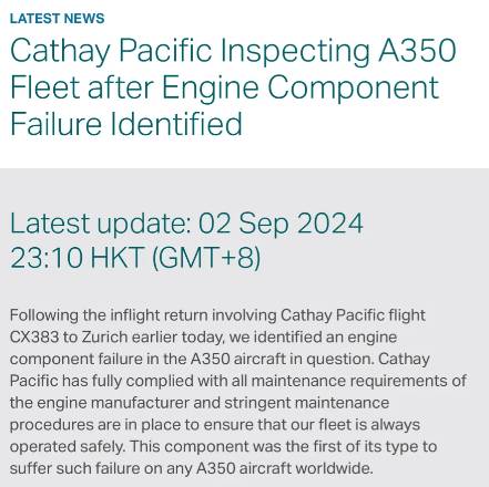 In the early hours of September 2, Cathay Pacific Airways flight CX383 to Zurich, Switzerland, turned back to Hong Kong shortly after take-off due to a sudden failure. The engine of the Airbus A350 was found to have a component failure.