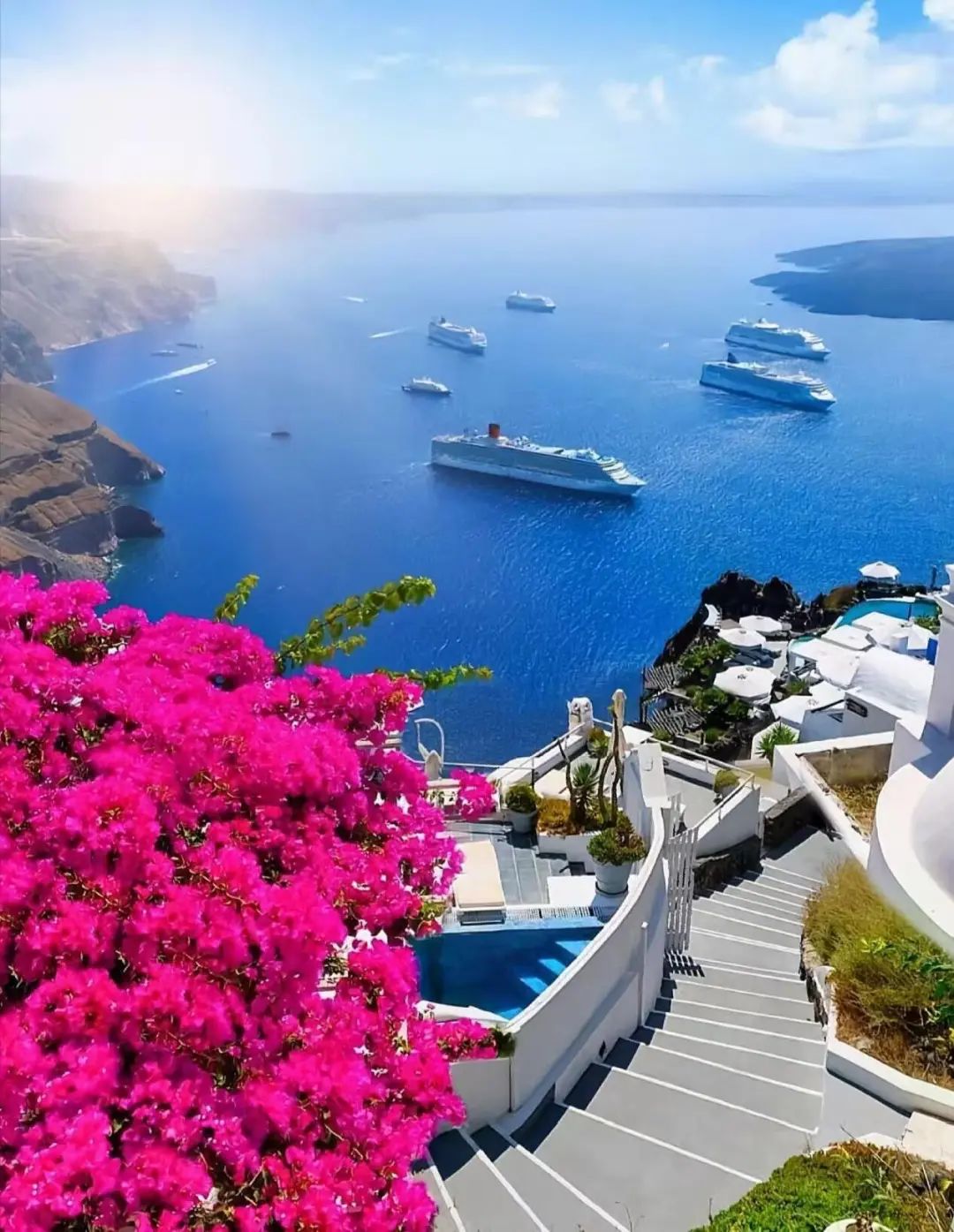 The world's most beautiful archipelago 💗 Santorini Island (Greece) Steep volcanic cliffs, blue roofs and white walls of the building complex cascading and overlooking the deep blue Aegean Sea. Every dusk, the setting sun colors the entire island in gold, making it one of the most romantic places in the world to watch the sunset.